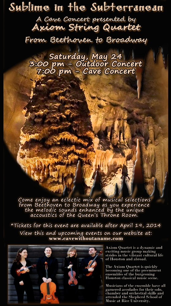 Visiting Hill Country could be a great way to celebrate Memorial Day weekend! Come out and enjoy Axiom Quartet in the Cave! More information about the tickets to our concert, directions and on the Cave Without a Name here: