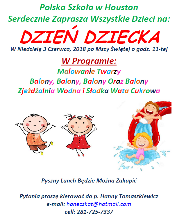 Polish School invites all children and their parents to celebrate Children’s Day in the Polish Parish on Sunday, June 3, 2018, after 11 am mass.