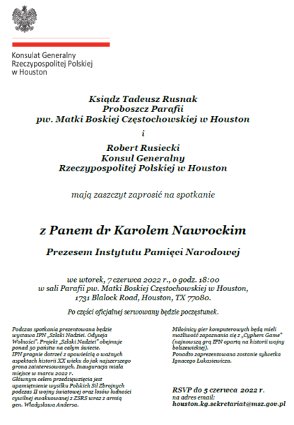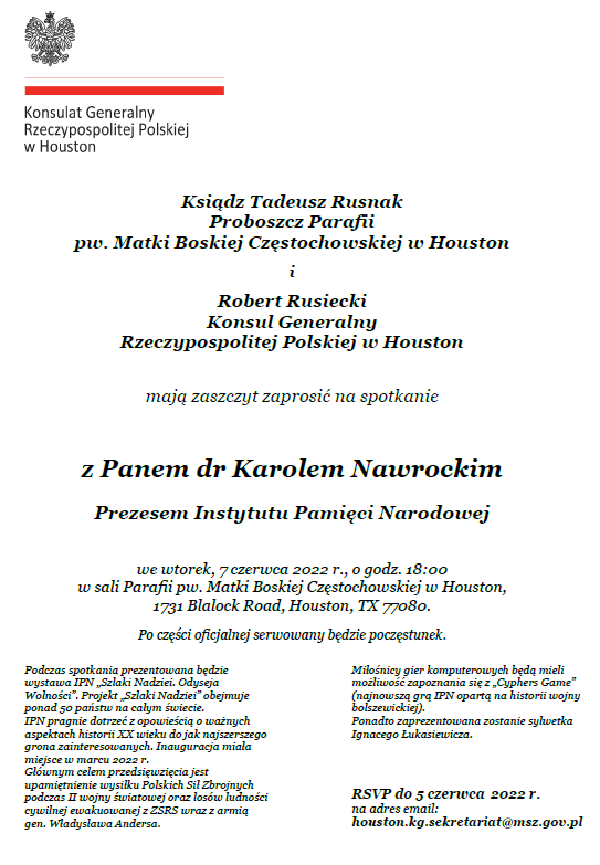 Father Tadeusz Rusnak, pastor of the parish of Our Lady of Częstochowa, and Robert Rusiecki, Consul General of the Republic of Poland in Houston, invite you to a meeting with Dr. Karol Nawrocki, President of the Institute of National Remembrance, which will take place on