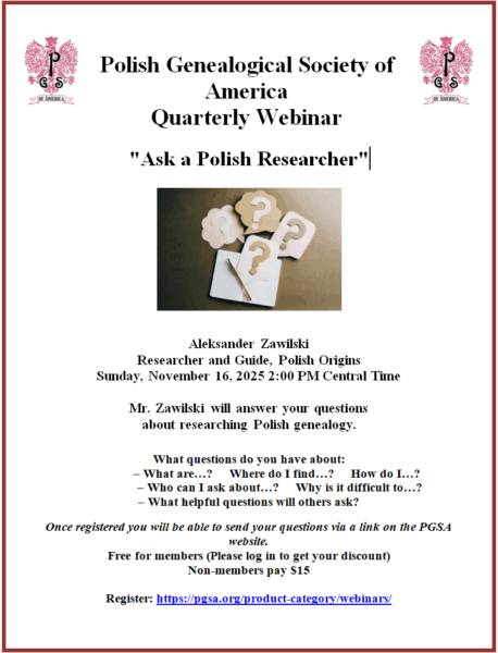The Polish Genealogical Society of America is hosting its next quarterly webinar on November 16th at 2pm Central Time.