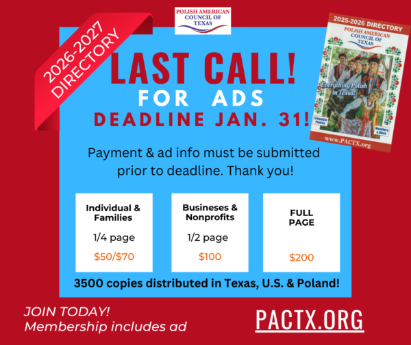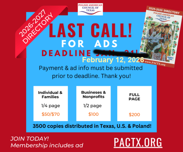 It is time to renew your Polish American Council of Texas dues in preparation for the 2026-27 Directory of Everything Polish in Texas, which is distributed in Texas, USA, & Poland!