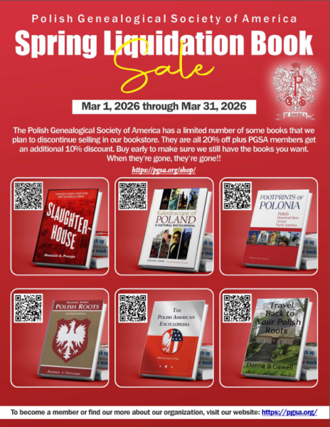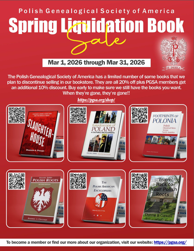 For the month of March 2026, the Polish Genealogical Society of America is hosting a spring liquidation book sale. We have a number of books that we plan to discontinue selling in our bookstore. They are all 20% off, plus PGSA members get an additional 10% discount on top of that. Once the books are gone, they will not be restocked!